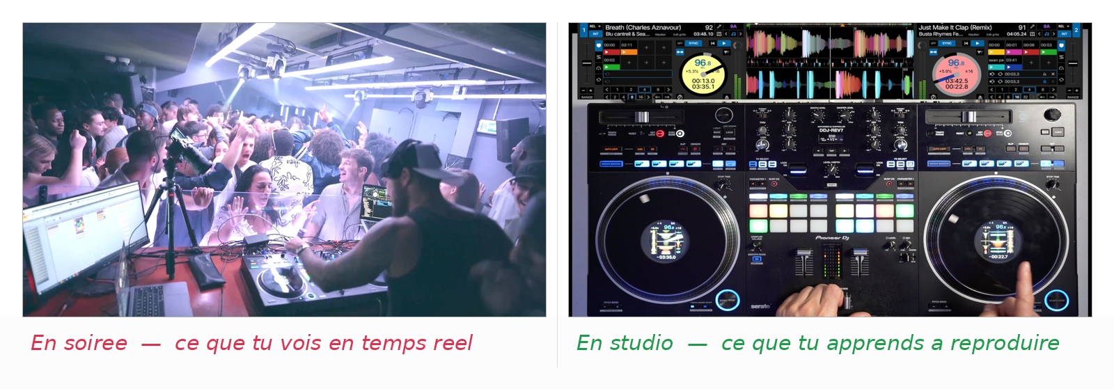→ Tu vois exactement ce que je vois derrière les platines — la sélection en cours, ce qui arrive ensuite, comment je gère les BPM, le scratch, les transitions marquantes